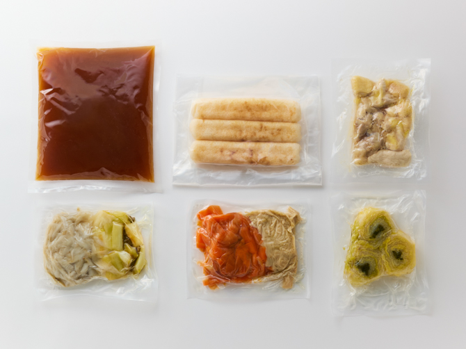 ②「きりたんぽ用だし」とすべての具材を鍋に移します。袋の中の汁ごと全部入れてください。