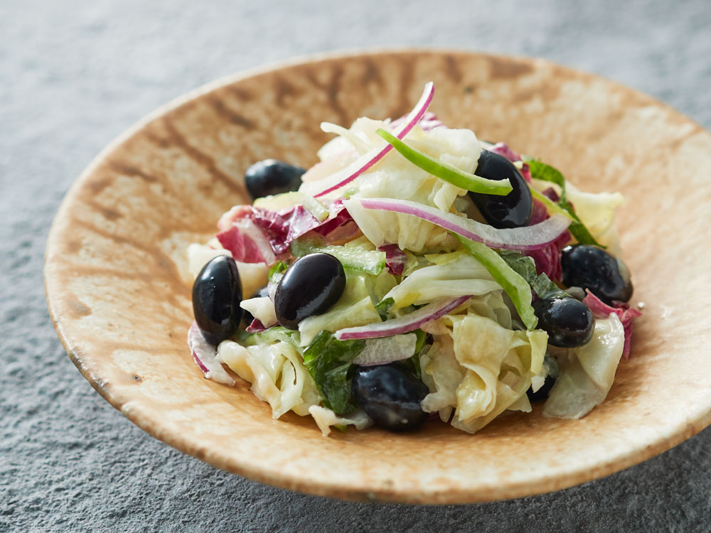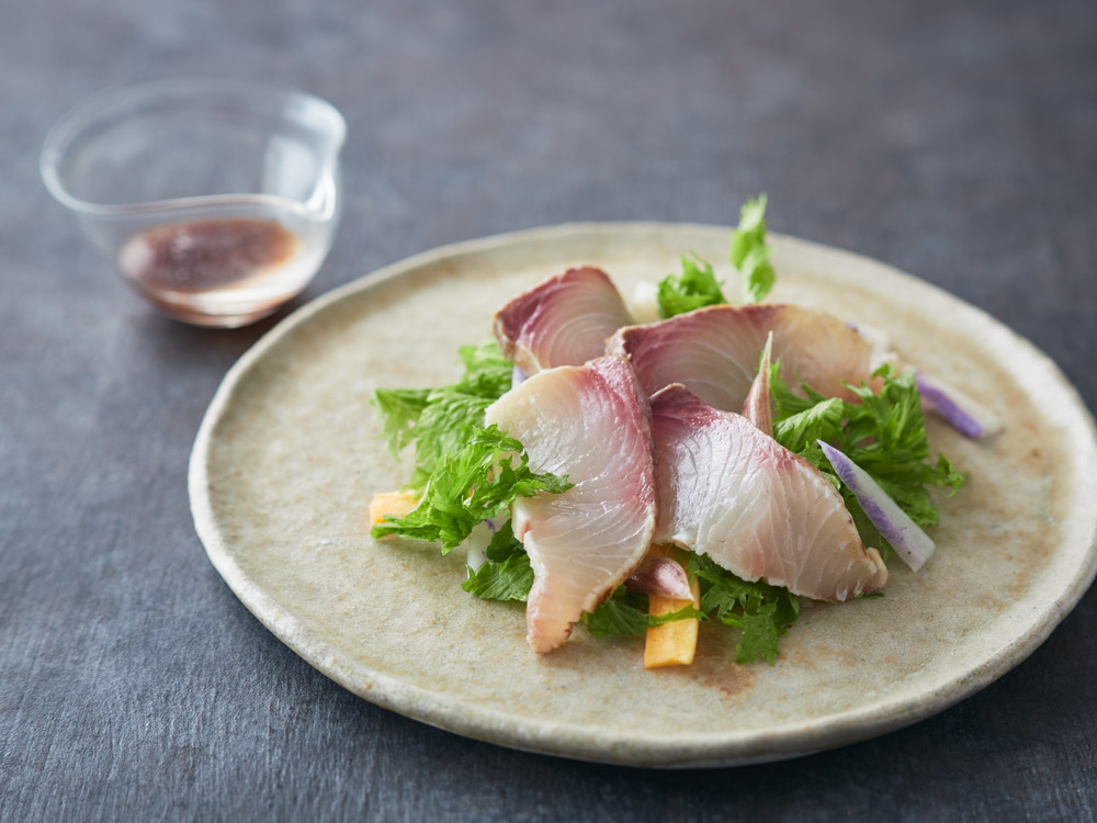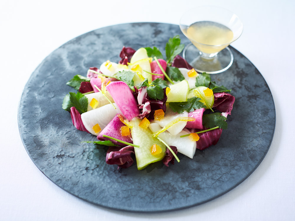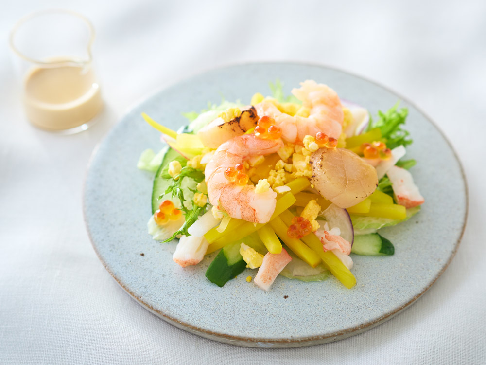 出汁で炊いたじゃがいもに、白味噌や酢、柚子皮、チーズを合わせたやさしい味わいのソースをまとわせたポテトサラダ。人気の素材の海老とアスパラを添えて、彩りも豊かに仕上げました。柚子の香りがやさしく広がり、和の風味を引き立てます。