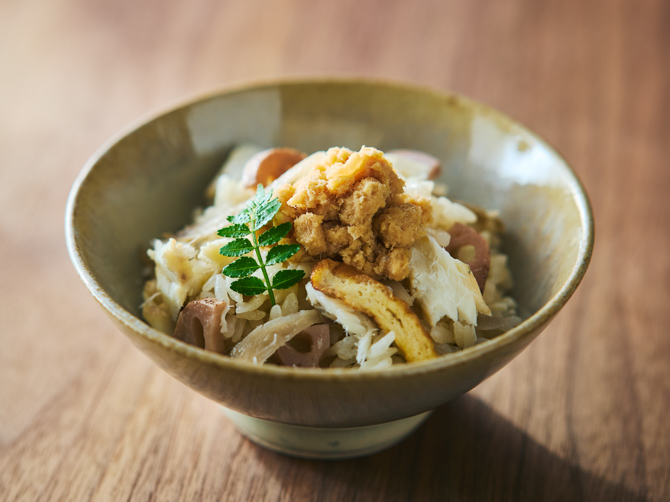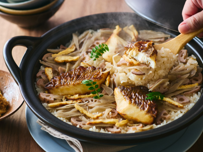 ②炊飯器具に「炊飯だし」を入れ、「つばき鯛」「ごぼう」「刻み揚げ」、汁気を切った「れんこん」を入れてください。
