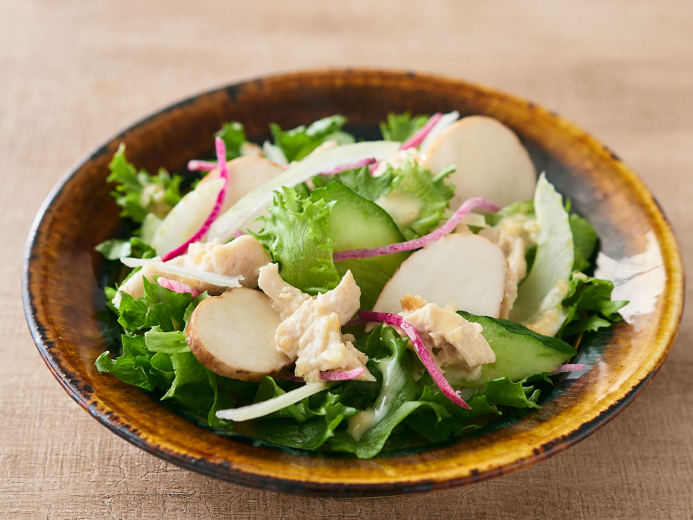 湯葉の穏やかな風味に、野菜の食感を合わせ、落ち着いた味わいに仕立てました。茹でた野菜を湯葉とともにきのこあんで和えることで、口に含むたびにお出汁の旨みがひろがります。ほっと安らぐような味わいは、小鉢としてはもちろん、献立のもう一品としても重宝する一皿。