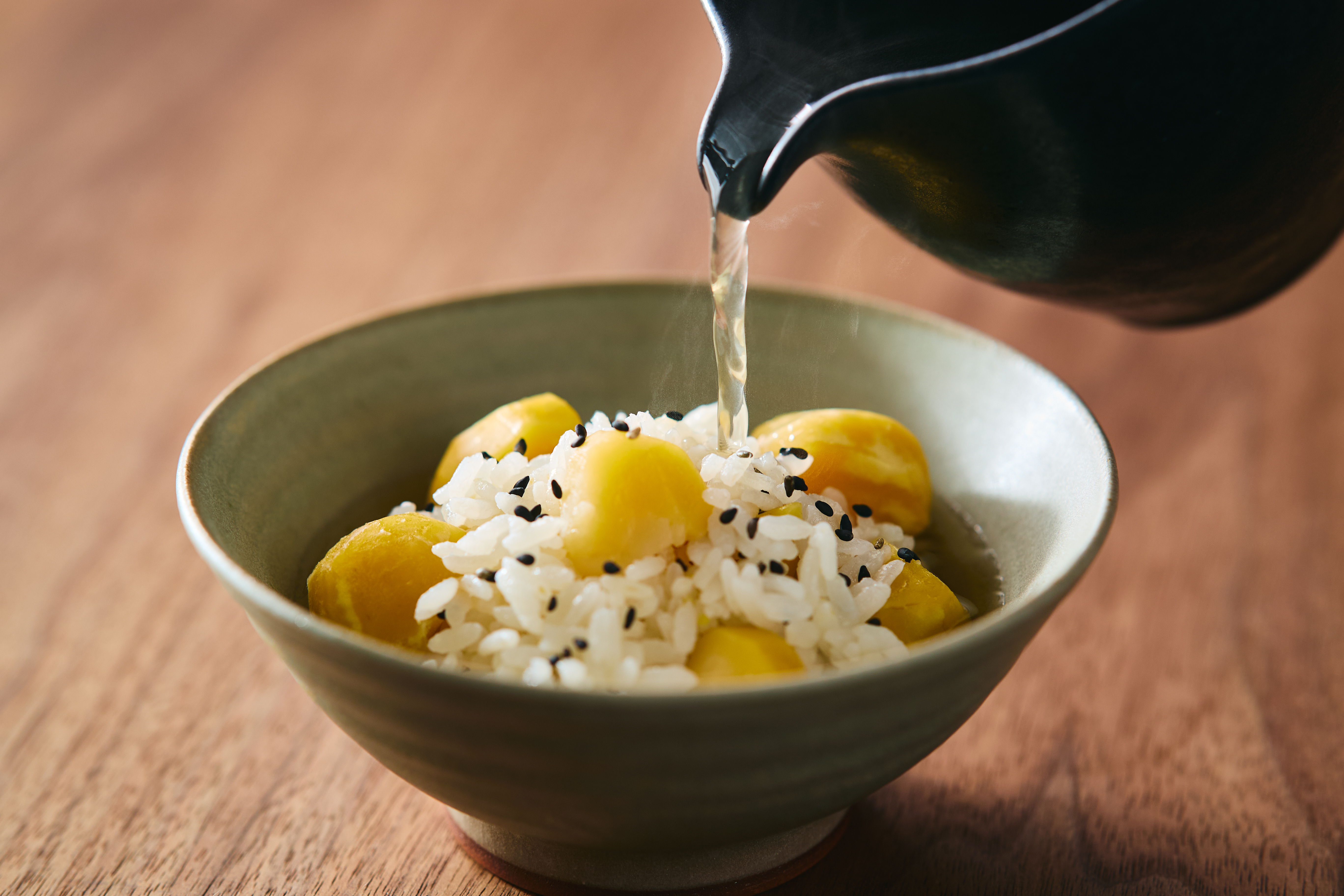 銀だら味噌をのせて、茶漬けだしと、ひと品でいく通りの味わいに。 国産栗の味わいと共に炊き立ての美味しさを楽しめます。