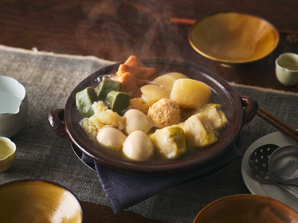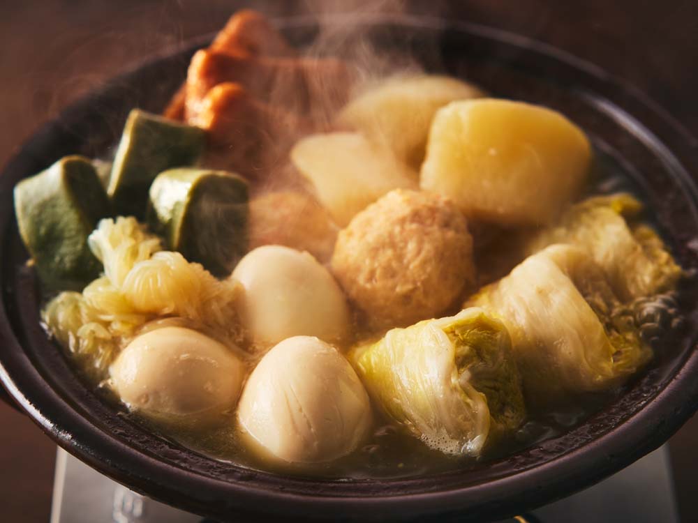 おでん種の定番「大根」「玉子」「結び糸こんにゃく」、旨みが染み出る「海老しんじょう」「平天」、食感と香りのよい「生麩」、食べ応えのある「岩手で育てた絶品鴨と豚肉の白菜巻き」。