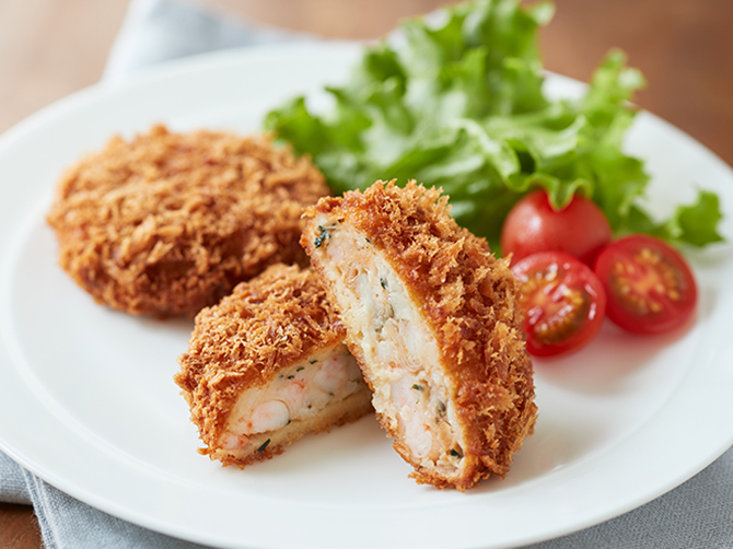 【海老と帆立のカツ】 卵・乳成分・小麦・えび・かに・大豆・いか・ごま