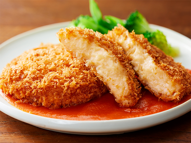 【トマトソースで味わう 蟹クリームコロッケ】(本体)乳成分・小麦・えび・かに・大豆・鶏肉・ゼラチン、(洋食トマトソース)小麦・大豆・鶏肉