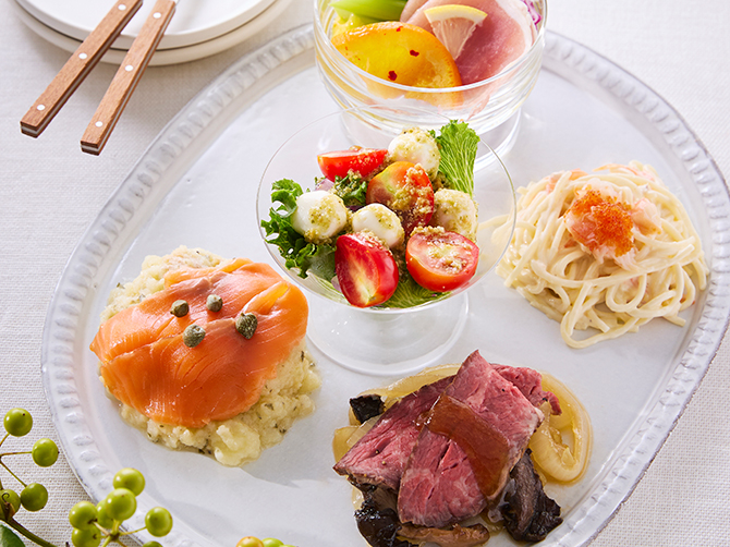 色鮮やかで相性の良いトマトとモッツァレラチーズのサラダは、テーブルを華やかに彩ります。香り高いバジルソースでどうぞ。
