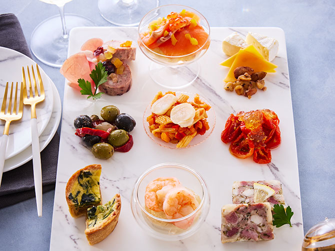 - サーモントラウトとポテトのサラダ(国内製造)、海老のカクテル、ジャンボン・ペルシエ(ハムとパセリのゼリー寄せ)、帆立とペンネトマトソース、パテ・ド・カンパーニュのドライフルーツ添え、セミドライトマトのジュレサラダ、ほうれん草とベーコンのミニキッシュ、チーズ(カマンベールチーズ、チェダーチーズ)とはちみつベーコンナッツ、オリーブ・アンチョビ、生ハム、イタリアンパセリ/pH調整剤、酒精、リン酸塩(Na)、酸化防止剤(V.C)、調味料(アミノ酸等)、発色剤(亜硝酸Na)、香辛料抽出物、香料、増粘剤(加工デンプン、増粘多糖類)、着色料(カラメル、カロチノイド、コチニール)、酸味料、漂白剤(亜硫酸塩)、グルコン酸第一鉄、乳酸Ca、(一部に落花生・卵・乳成分・小麦・えび・くるみ・大豆・さけ・さば・いくら・牛肉・豚肉・鶏肉・オレンジ・りんご・ゼラチン・アーモンドを含む)