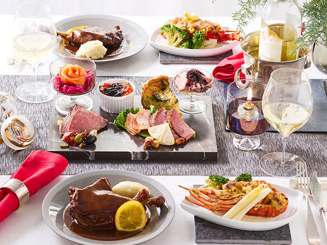 - 岩手で育てた絶品鴨のもも肉赤ワイン煮込み(国内製造)、ロブスターグラタン、トリュフポテト、ほうれん草とベーコンのキッシュ、カポナータ バルサミコジュレ、白ワインソース、タコとセロリのマリネ、牛肉のグリエとグリルオニオン、スモークサーモントラウトとレッドキャベツのマリネ、ブロッコリー、ホワイトアスパラ、黒胡椒ハム、グリーンリーフ、オレンジ、ボロニアソーセージ、カマンベールチーズ、オリーブ・アンチョビ、蜂蜜黒胡椒ナッツ/糊料(加工デンプン、増粘多糖類)、リン酸塩(Na)、酸化防止剤(V.C)、調味料(アミノ酸等)、発色剤(亜硝酸Na)、香辛料抽出物、香料、着色料(ウコン、カラメル)、酸味料、漂白剤(亜硫酸塩)、グルコン酸第一鉄、乳酸Ca、(一部に卵・乳成分・小麦・えび・大豆・さけ・牛肉・豚肉・鶏肉・オレンジ・りんご・ゼラチン・カシューナッツを含む)