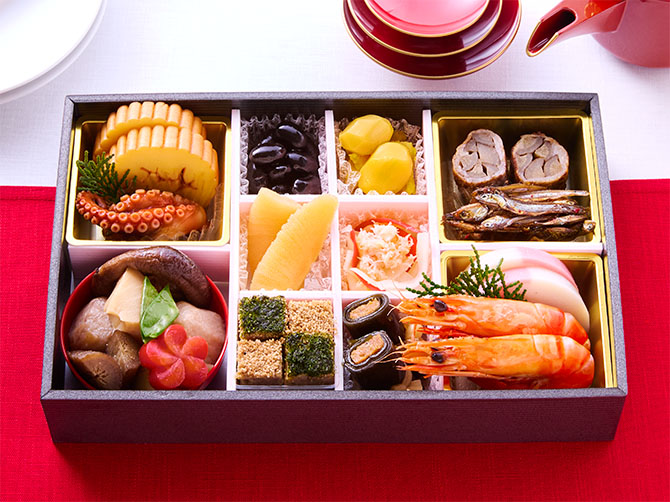 - 煮しめ(国内製造)、松風焼き、伊達巻き、安納芋の栗きんとん、紅白かまぼこ、和牛の八幡巻き、たこの照り焼き、焼き海老、穴子の昆布巻き、蟹入り紅白なます、数の子、丹波黒 黒豆、田作り/増粘剤(加工デンプン、増粘多糖類)、重曹、漂白剤(次亜硫酸Na)、着色料(カラメル、カロチノイド、紅麹)、酒精、調味料(アミノ酸等)、酢酸Na、グリシン、加工デンプン、トレハロース、pH調整剤、乳化剤、酸化防止剤(亜硫酸塩、エリソルビン酸Na)、ソルビトール、(一部に卵・小麦・えび・かに・大豆・さば・牛肉・鶏肉を含む)