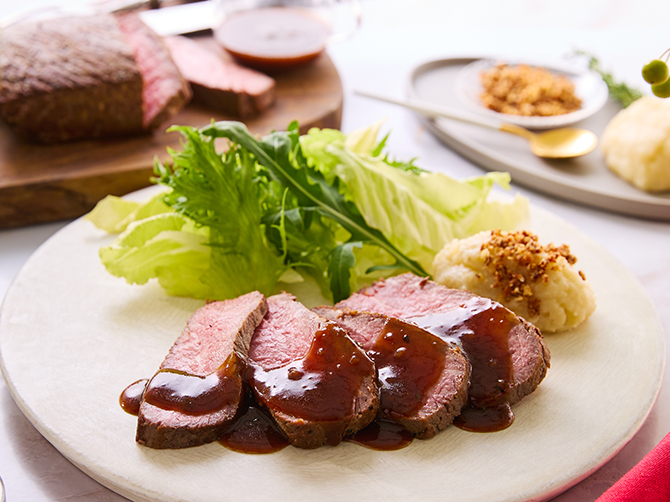 ④ 「プライムローストビーフ」に温めた「赤ワインソース」をかけて召し上がってください。