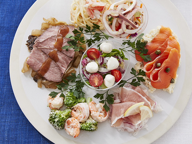 - サーモントラウトとツナポテトのサラダ(国内製造)、ローストビーフのサラダ、生ハムのマリネ、イカのマリネ マスタード風味、海老とブロッコリーのクリーミーソース、蟹のシーフードパスタサラダ、トマトとモッツァレラチーズのサラダ、イタリアンパセリ/増粘剤(加工デンプン、増粘多糖類、CMC)、調味料(アミノ酸等)、着色料(ウコン、カラメル)、酸味料、香辛料抽出物、発色剤(亜硝酸Na)、(一部に卵・乳成分・小麦・えび・かに・大豆・いか・さけ・牛肉・豚肉・鶏肉・りんごを含む) <香り高いバジルソース>植物油脂、バジルソース、ローストピーナッツ、チーズ、レモン果汁、魚醤(魚介類)、にんにく調味料、麦芽糖調製品(麦芽糖、寒天)、食塩、香辛料/増粘多糖類、(一部に落花生・乳成分・魚醤(魚介類)を含む)
