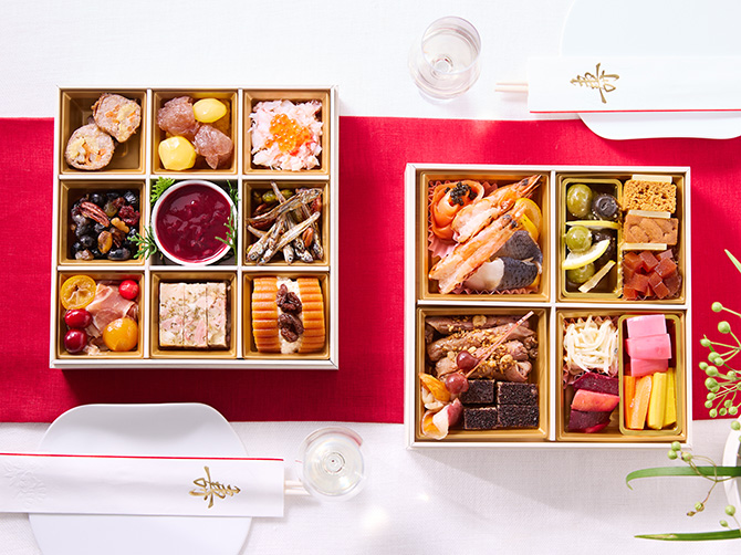 - 伊達巻(国内製造)、マロングラッセと安納芋の栗きんとん、2種オリーブのマリネ、黒毛和牛の八幡巻き、黒毛和牛のローストビーフ、ジャンボン・ペルシエ(豚肉のゼリー寄せ)、かにと根菜の甘酢、ソフトシェルシュリンプのグリル、ハモン・セラーノと金柑、黒豆とナッツとドライフルーツのコンディマン、フォアグラのフラン、レーズンとクルミの松風焼き、ビーツとリンゴのマリネ、ニシンのオレンジマリネ、カラフル人参のピクルス、スモークサーモン、ピーカンナッツとピスタチオの田作り、根セロリのレムラード、メンブリージョ(西洋カリンの固形ジャム)、パン・デピス(フランスの伝統的なお菓子)、マグレ・ド・カナールの生ハムとドライ市田柿、赤かぶのスパイスピクルス、コンテチーズ、グリオットチェリーのキルシュ漬け/糊料(加工デンプン、増粘多糖類)、pH調整剤、酒精、リン酸塩(Na)、酸化防止剤(V.C)、調味料(アミノ酸等)、発色剤(亜硝酸Na、硝酸K)、香辛料抽出物、香料、着色料(ウコン、カラメル、クチナシ黄色素、紅花黄、野菜色素)、漂白剤(亜硫酸塩)、酸味料、ベーキングパウダー、グルコン酸第一鉄、(一部に卵・乳成分・小麦・えび・かに・くるみ・大豆・さけ・さば・いくら・牛肉・豚肉・鶏肉・オレンジ・りんご・ゼラチン・カシューナッツ・ごま・アーモンド・魚醤(魚介類)を含む)