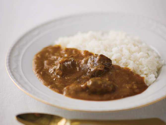 - 牛肉(国産)、チキンブイヨン、オニオンソテー、ブイヨン(仔牛骨、牛肉、野菜(玉葱、人参、セロリ、にんにく)、その他)、リンゴピューレ、小麦粉、バター、トマトケチャップ、マンゴーペースト、植物油脂、香辛料、食塩、カレー粉、香味調味料、にんにく、生姜/酸味料、調味料(アミノ酸)、着色料(カラメル)、香辛料抽出物、(一部に乳成分・小麦・大豆・牛肉・鶏肉・りんごを含む)
