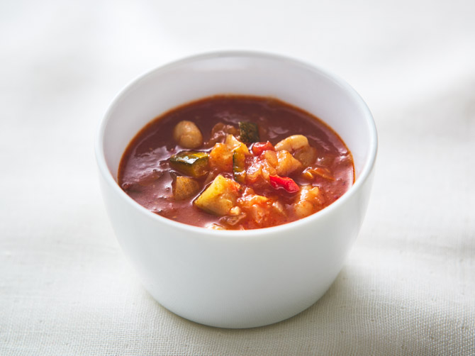 トマトをメインに、野菜、豆、ベーコンなど10品目を使用し、野菜の旨みを引き出しました。トマトのおいしさを感じることができる、具だくさんのスープです。