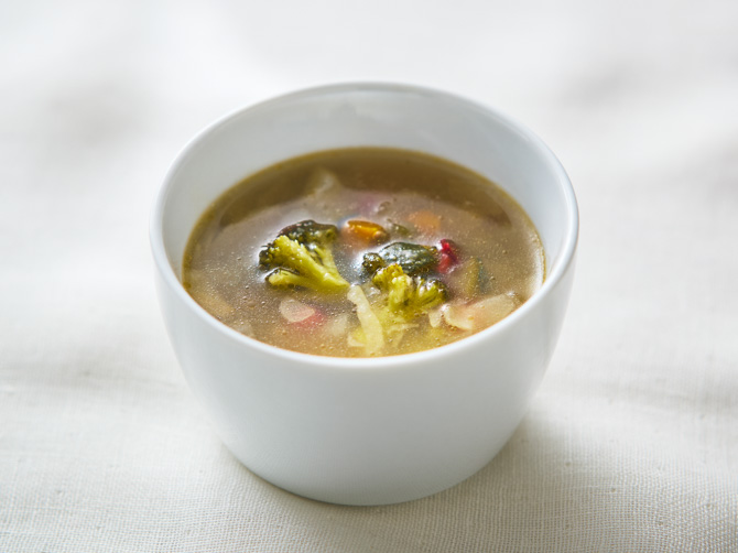 ブロッコリーやかぼちゃなどの野菜を、野菜ブイヨンとシンプルな味付けで仕上げました。野菜の色や食感を大切にしたやさしい味わいのスープです。