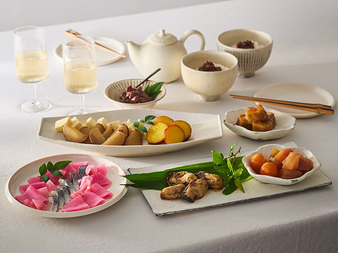やさしい味わいの「紫大根と生姜の甘酢漬け」は、昆布で香りと旨みを引き立てた「にしんの昆布〆」によく合います。「柚子香る丸十煮」は、煮込んださつまいもを、柚子の皮と果汁で爽やかに。「いぶりがっこ」は、「みりん粕漬けクリームチーズ」と一緒にどうぞ。