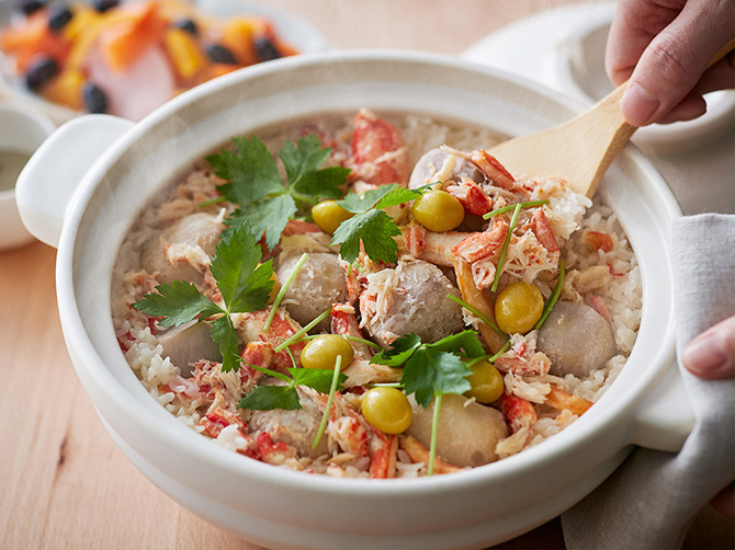 蟹の旨みが染み込んだお米と、蟹の身を一緒に。里芋のねっとり、ほくっとした食感もたまりません。