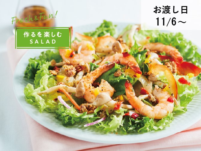 ③ 袋に残ったグリル海老を②にバランスよく盛りつけ、「ザクザクチーズトッピング」を全体に散らします。