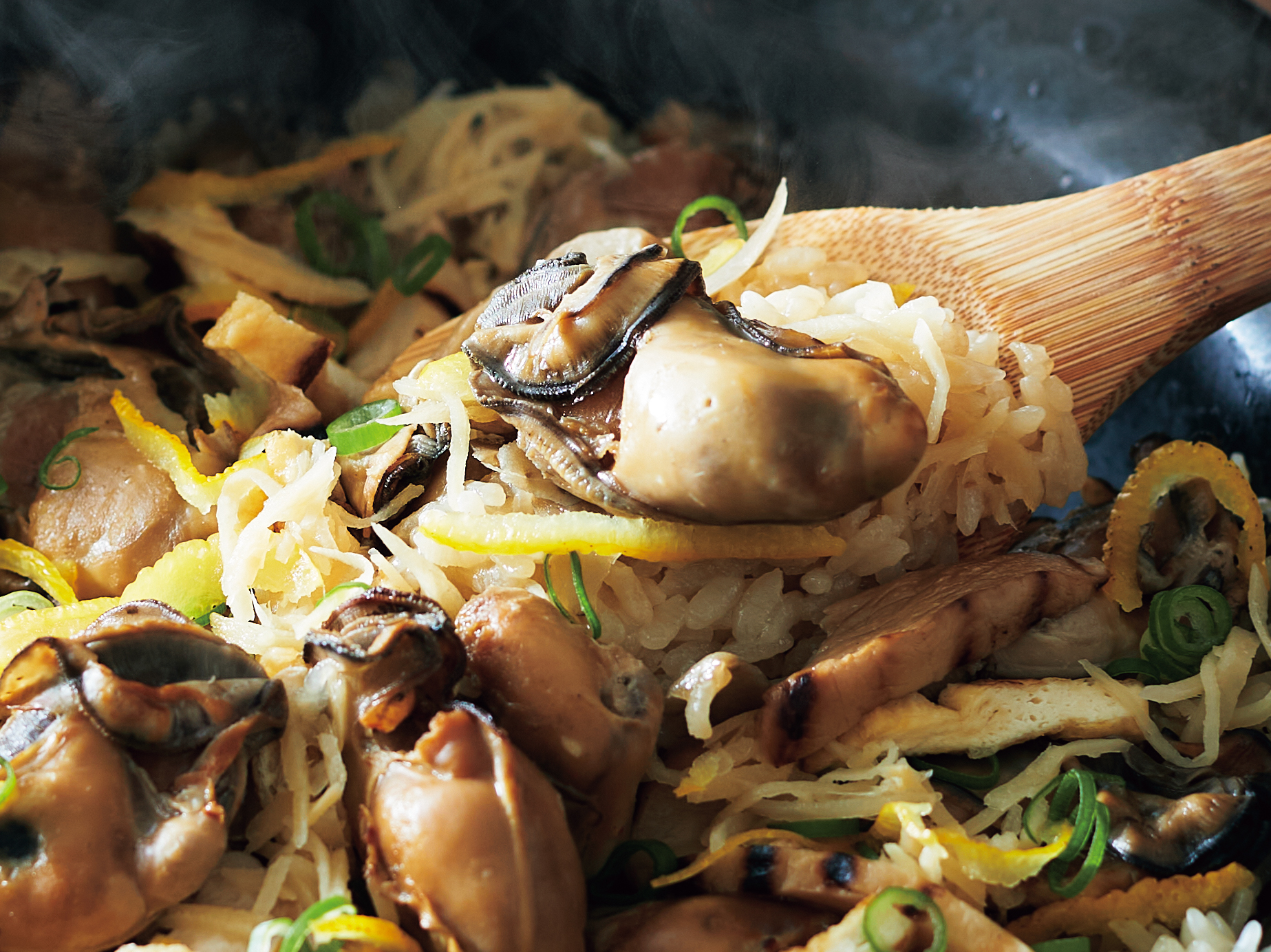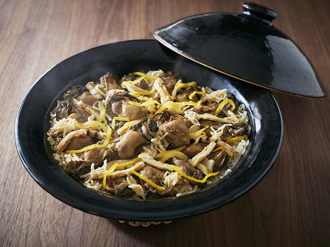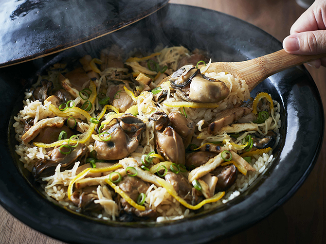 牡蠣・焼きハクレイダケ・ごぼう・あげを、だし・牡蠣汁と一緒に炊き上げます。最後に生姜の酢漬け・柚子皮を散らして出来上がり。