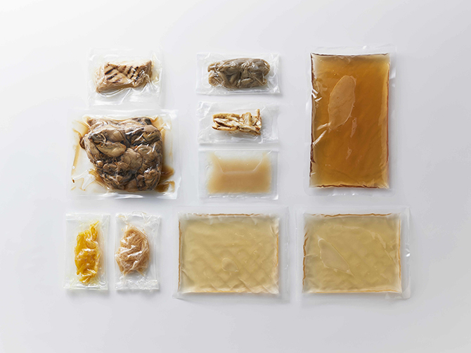 - 炊き込み用だし(だし汁(昆布だし、かつお節、昆布)、醤油加工品、食塩、醤油、みりん)、茶漬け用だし(だし汁(昆布だし、かつお節、昆布)(国内製造)、食塩、かつお節)、牡蠣(蒸し牡蠣、調味だし(醸造調味料、醤油、乾椎茸、かつお節、さば節、煮干し(イワシ)、昆布)、醤油、みりん、砂糖、ハチミツ)、焼きハクレイダケ(はくれい茸、香味食用油、食塩)、ごぼう(ごぼう、だし汁(昆布だし、かつお節、昆布)、植物油脂、みりん、醤油、食塩)、牡蠣汁、生姜の酢漬け(生姜、醸造酢)、柚子皮(ゆず皮、醸造酢)、油揚げ/調味料(アミノ酸等)、凝固剤(塩化Mg)、着色料(カラメル)、(一部に小麦・大豆・さばを含む)