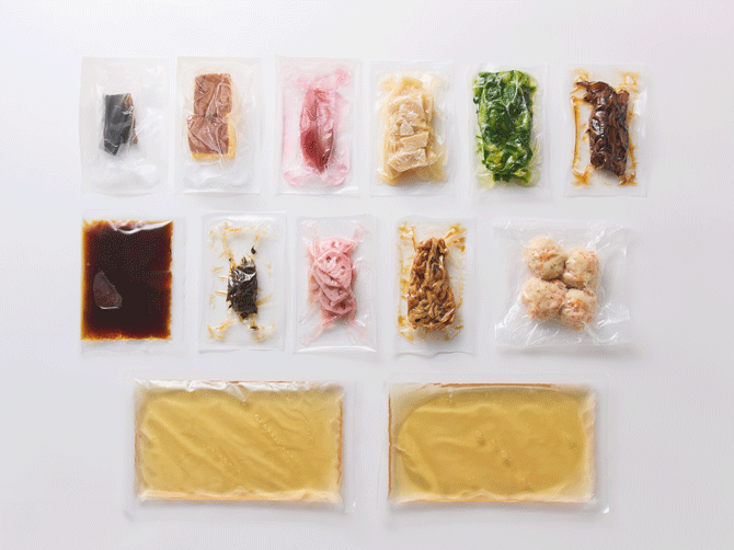 - だし汁(昆布だし、かつお節、昆布)(国内製造)、海老、菜の花、水煮筍、砂糖、きざみ穴子、醸造酢、蓮根、ミョウガ、酒、液卵黄、みりん、魚介すり身、しその実しょうゆ漬け、醸造調味料、醤油、液卵白、甘海老、甘味リンゴ酢、食塩、乾椎茸、マヨネーズ、昆布、山芋粉末、昆布だし、山芋ペースト、小麦加工品、ハチミツ、ラズベリー、パン粉、でん粉、魚醤、梅酢、生姜、ラズベリー果汁、かつお節、うなぎの骨/加工デンプン、酸化防止剤(V.C)、増粘剤(加工デンプン)、重曹、着色料(カラメル、紅花黄、野菜色素)、酸味料、香料、調味料(アミノ酸等)、香辛料抽出物、膨張剤、(一部に卵・小麦・えび・大豆・いか・やまいも・りんごを含む) ※野菜のうち、京野菜63%使用