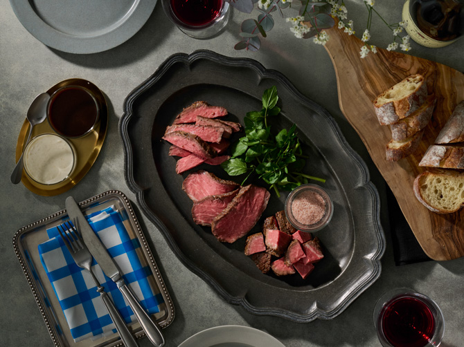 芳醇な赤ワインソース、西洋わさびの辛みがアクセントのホースラディッシュソース、お肉の旨みが際立つピンクロックソルトでお楽しみください。
