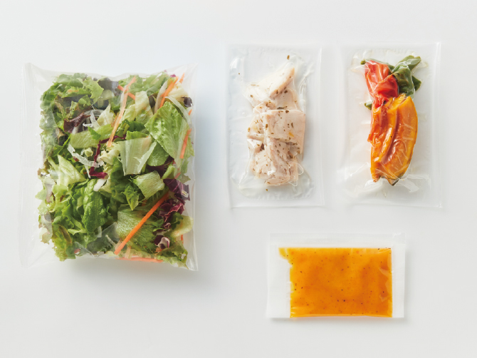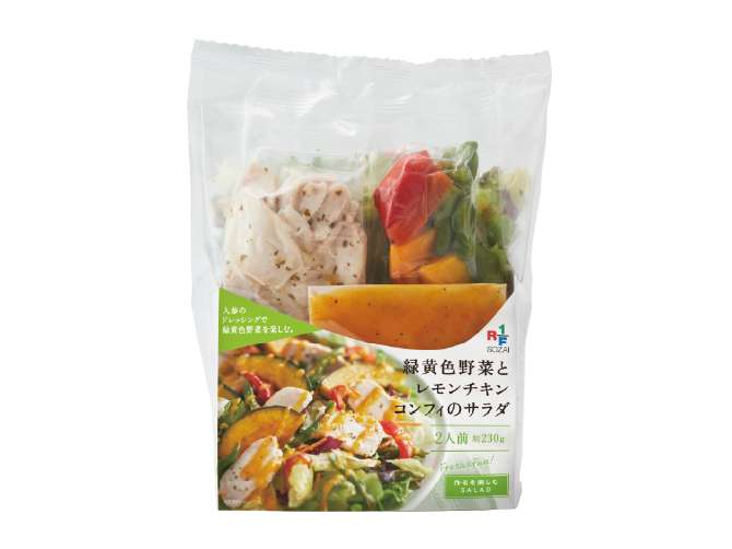 ② 葉野菜の上に「レモンチキンコンフィ」をほぐしながらのせます。