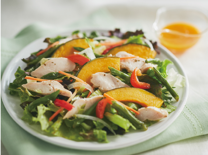 ③ 「かぼちゃ、いんげん、赤パプリカ」をバランスよく盛りつけます。