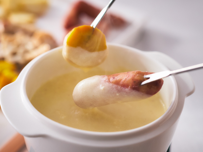 ① 沸騰したたっぷりのお湯に「フォンデュソース」「トゥールーズソーセージ4個」「チーズリゾット」を袋ごと入れ、弱火で約10分湯せんします。「チーズリゾット」はお召し上がりの直前までお湯につけておきます。また「ショコラータソース」は袋ごと入れ、弱火で約3分湯せんします。