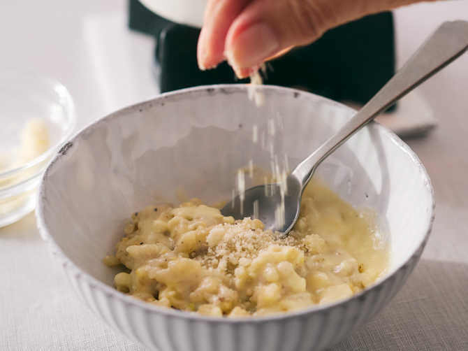 チーズフォンデュの余韻をそのままリゾットに。ソースを大さじ2杯ほど加えて混ぜ、レッジャーノパウダーをひとふり。お好みで黒胡椒を添えてもおすすめです。