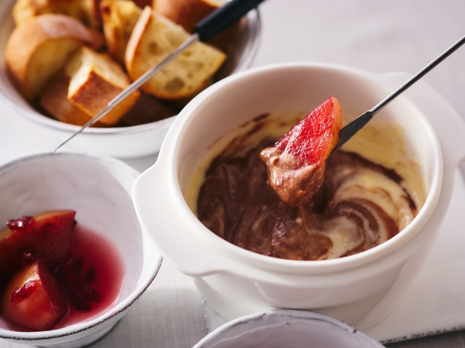 お鍋に残ったフォンデュソースにショコラータを加えて混ぜ合わせ、まろやかなショコラフォンデュに。リンゴのコンフィやバゲットをくぐらせて、デザートの〆をお楽しみください。