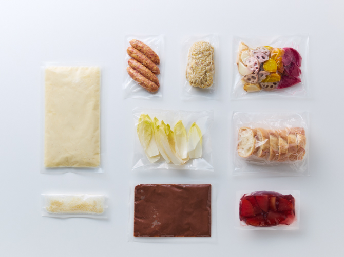 - フォンデュソース(牛乳(国内製造)、チーズ、酒、小麦粉、バター、香辛料、レモン果汁)、焼き野菜(蓮根、人参、じゃがいも、大根、植物油脂、食塩、醸造酢)、リンゴのコンフィ(リンゴ、酒、砂糖、ドライクランベリー、レモン果汁)、チーズリゾット(チキンブイヨン、米(イタリア産)、穀類(大麦、もちきび、もちあわ、アマランサス、ごま)、玉葱、酒、植物油脂、ベーコン、バター、チーズ、にんにく、食塩、香辛料)、ソーセージ、パン、ショコラータソース(牛乳、チョコレート、酒、小麦粉、バター、香辛料、レモン果汁)、チコリ、チーズ/pH調整剤、酒精、リン酸塩(Na)、酸化防止剤(V.C)、発色剤(亜硝酸Na)、調味料(アミノ酸)、香辛料抽出物、香料、セルロース、(一部に乳成分・小麦・豚肉・鶏肉・りんご・ゼラチン・ごまを含む)