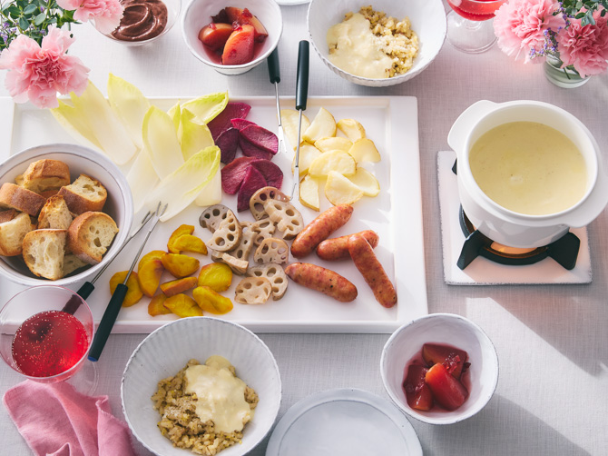 生野菜のチコリ、焼き野菜としてレンコン、じゃがいも、紅くるり、黄人参をご用意。ソーセージとともに濃厚なチーズフォンデュソースにつけて、ひと味違うおいしさをお楽しみください。