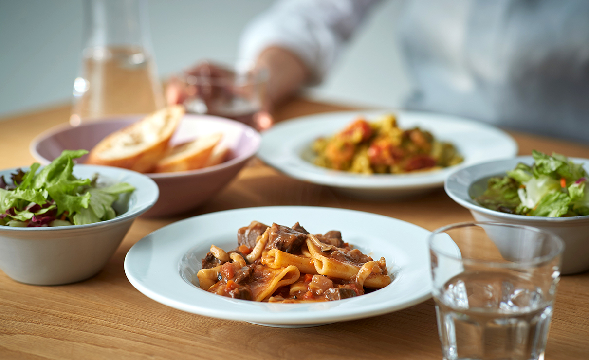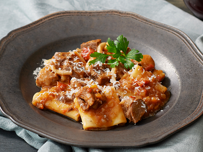 - ほどけるような柔らかさまで煮込んだ牛肉と、トマトや赤ワインなどで旨みを凝縮したラグーソース。牛肉、野菜、ワインの旨みが一体となった奥深いおいしさです。太い筒状のパスタは南イタリア生まれのパッケリ。もちもちした食感がソースとよく絡みます。