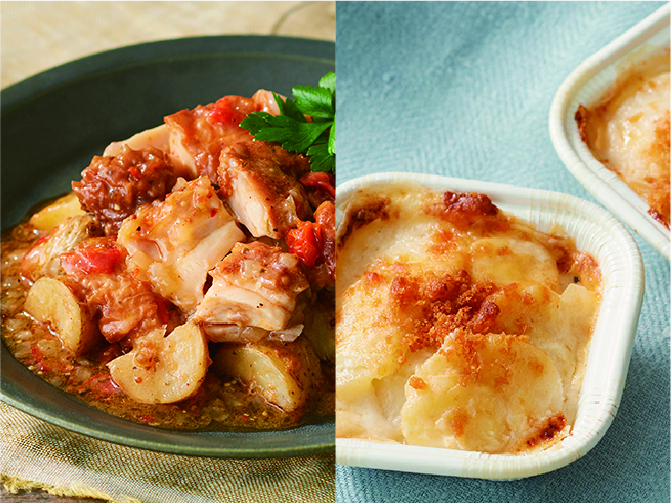 - スライスしたじゃがいもに、クリームソースとチーズでコク深い味わい。グラタンよりも少し濃厚なドフィノワは、ほんのりガーリックとチーズの濃厚さを感じる味わい。数種のチーズやパン粉を加えて焼き上げ、香ばしく仕上げています。ステーキなど肉料理や魚のローストなどの付け合わせにも。