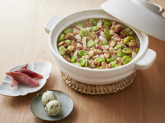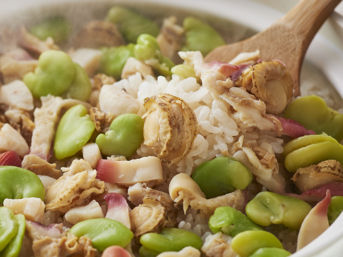 ほっき貝とそらまめを散らし、蒸らせば出来上がり。貝の弾力と旨み、ほっくりとした豆の甘さが味わえます。