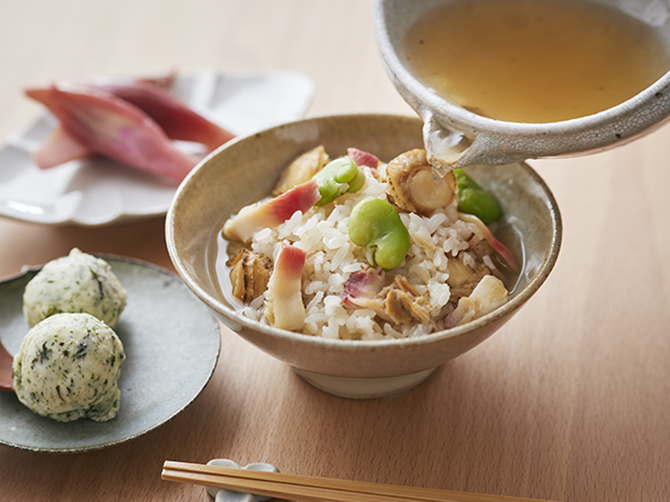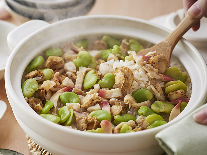 ③ 炊き上がったら火を止めて約10分蒸らし、②で汁切りした「ほっき貝」、「そらまめ」を入れてさらに約5分保温して出来上がりです。